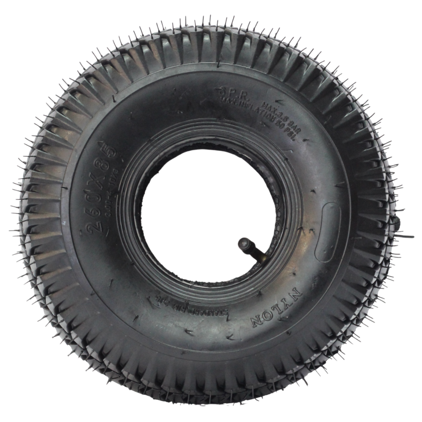 Opona z dętką 3.00-4 (260x85) 6PR niezawodny wybór do lekkich i średnich prac w ogrodzie, na działce czy podwórku. Charakteryzuje się wytrzymałą gumową oponą, która zapewnia trwałość przy codziennym użytkowaniu. Opona z dętką świetnie sprawdza się w lekkim transporcie, oferując bardzo dobry stosunek jakości do ceny.